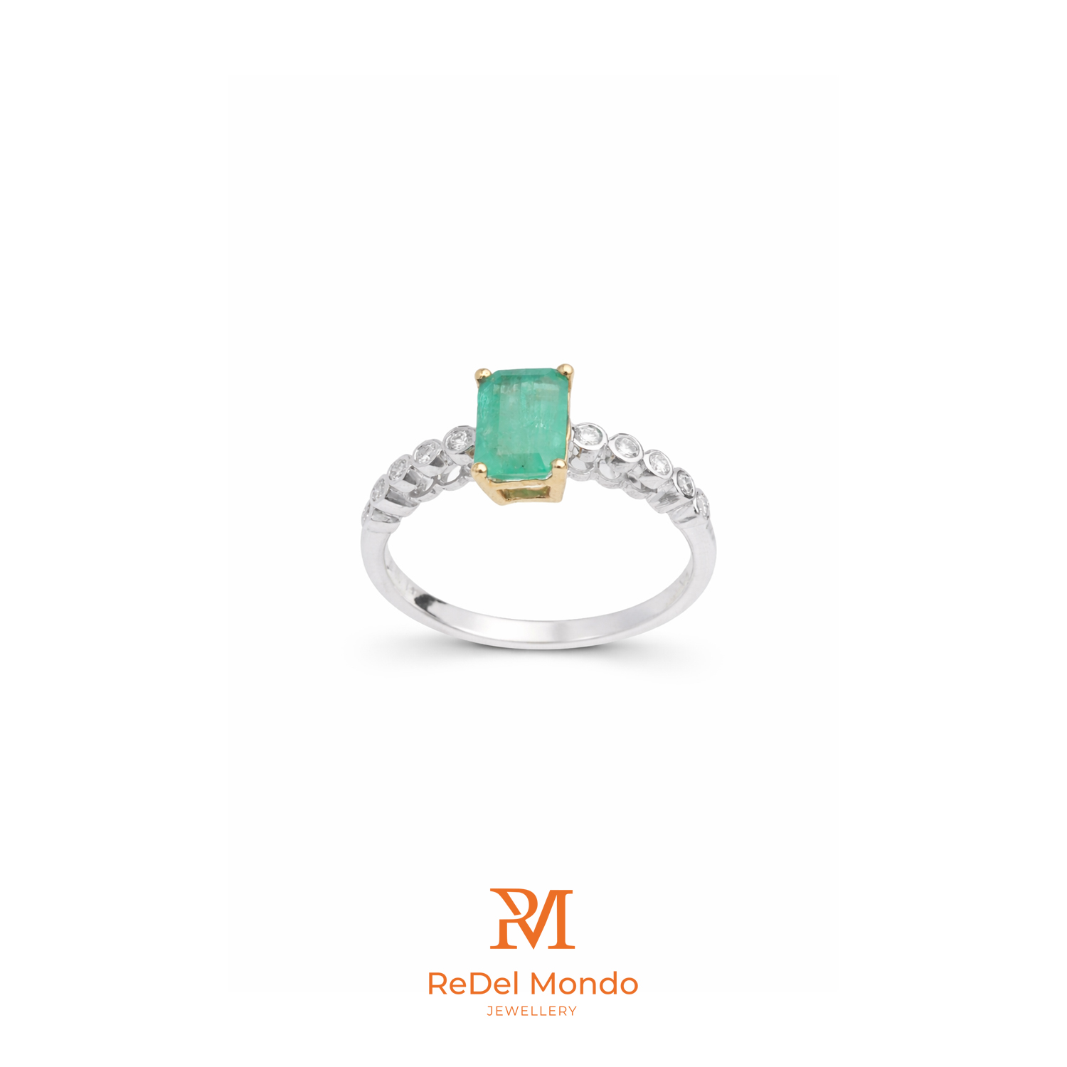 This exquisite ring from the ReDel Oui Fringe collection features 18k Italian white gold paired with a unique Colombian emerald of 1.010 carats, elegantly cut in an emerald shape.