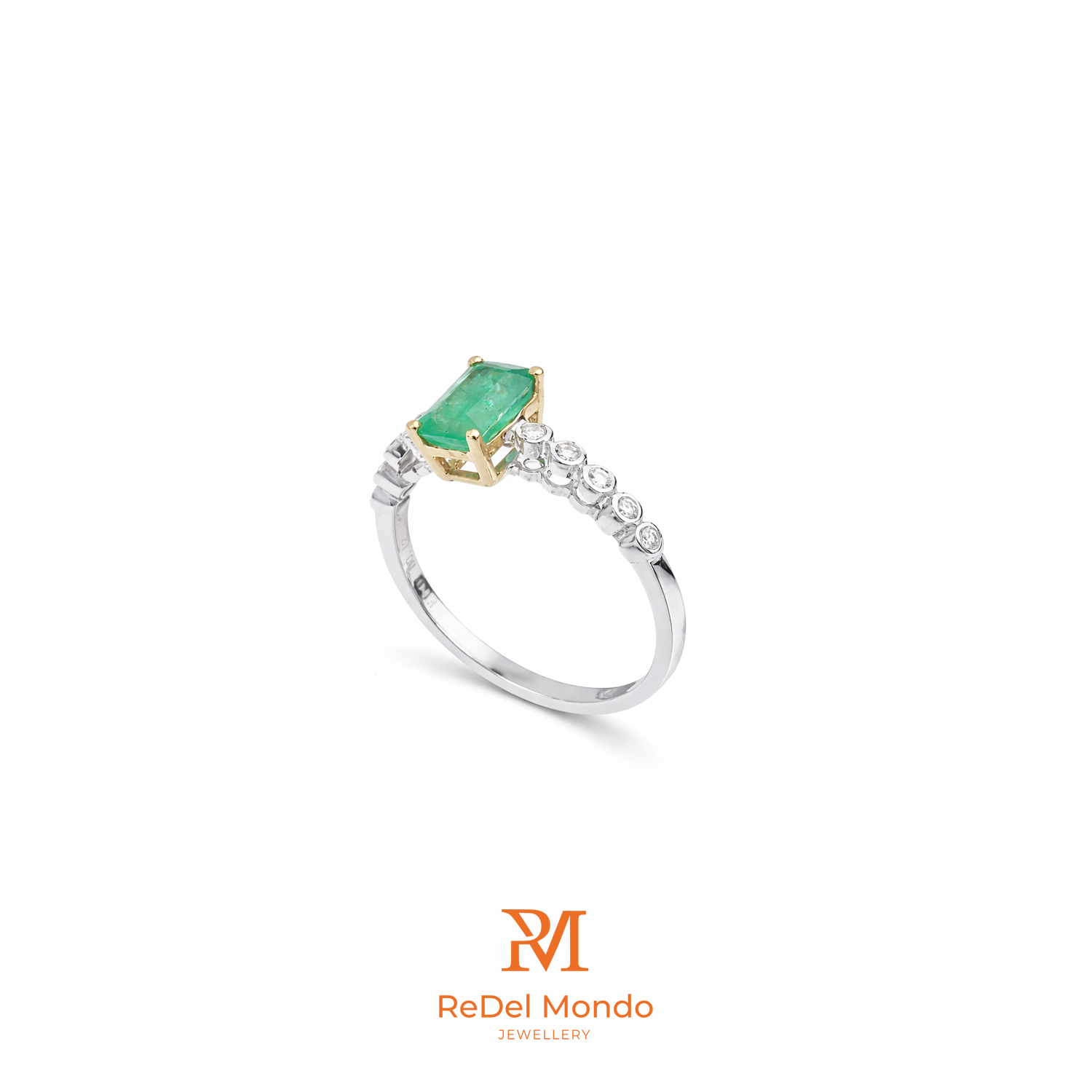 This exquisite ring from the ReDel Oui Fringe collection features 18k Italian white gold paired with a unique Colombian emerald of 1.010 carats, elegantly cut in an emerald shape.